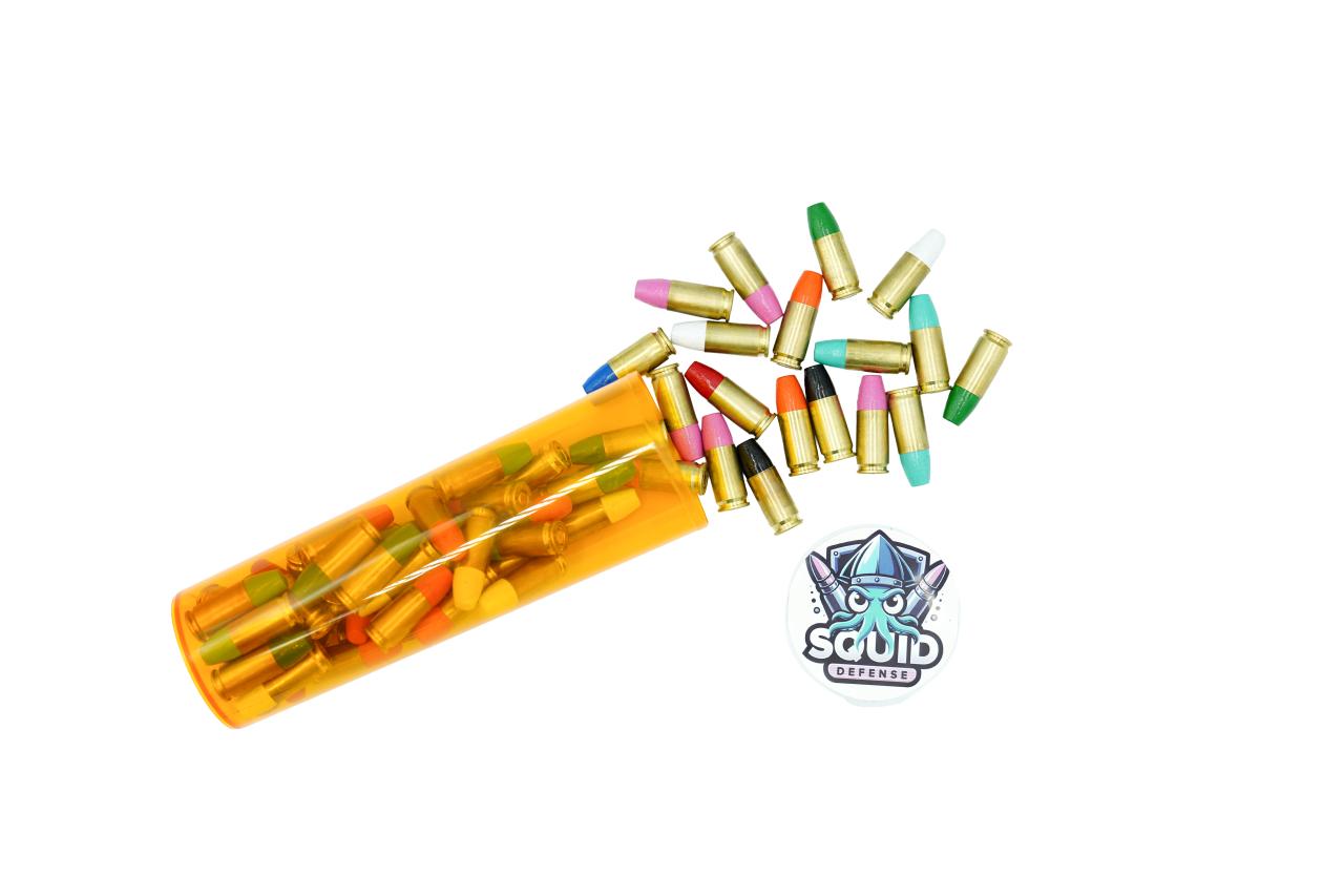 "pills," mixed colored poly coated subsonic ammo. Comes in a pill bottle.